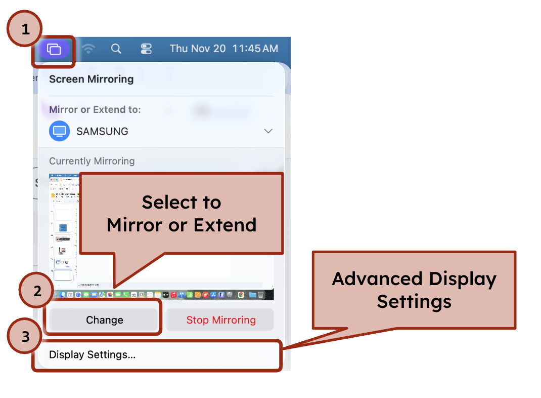 When using a TV with a computer, you have two options for displaying, mirroring and extend. Extend uses the projector as a secondary screen, while mirroring shows the same image on both screens. A majority of the time you will want mirroring turned on. You can turn it on with the following steps: