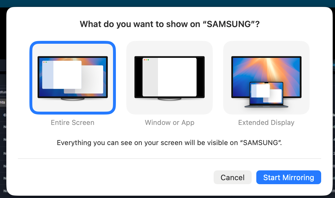 - Window or App - Show a specific window on the screen, everything else is only on the monitor.