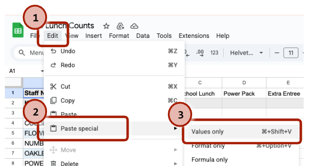 Use the Edit menu in Google Sheets, select Paste special -> Values only